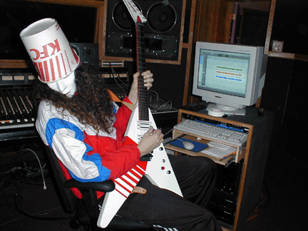 Keys are piano, cello and Virus synth. Bass is the Moog. Buckethead is playing through his 5150 amp.